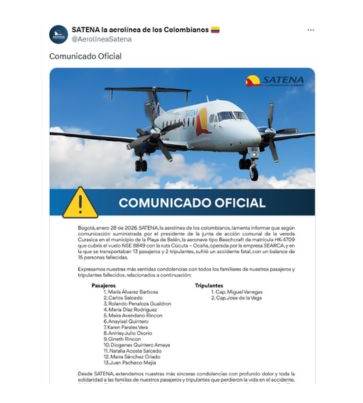 根據外媒報導,哥倫比亞東北部北桑坦德省(Norte de Santander)一架國營航空公司 Satena 的小型飛機,于28日飛行時失聯,隨後證實在偏遠山區墜毀,機上15人全數罹難,後續傳出,機上有多名政要,目前已知有一名國會議員,相關單位已展開事故調查。