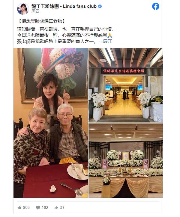 根據《ETtoday星光雲》報導,資深音樂人張錦華日前辭世,享壽75歲,台語歌壇天后龍千玉出席恩師的告別式,場面令人鼻酸。龍千玉透露,這些日子以來不斷嘗試調適心情,如今要送老師走完人生最後旅程,內心充滿了難以言喻的哀傷。