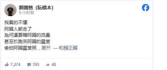 鋼鐵爸深夜發文,表示「我真的不懂,阿國人都走了,為何還要蹭阿國的流量,甚至跑來阿國的靈堂[偷.
