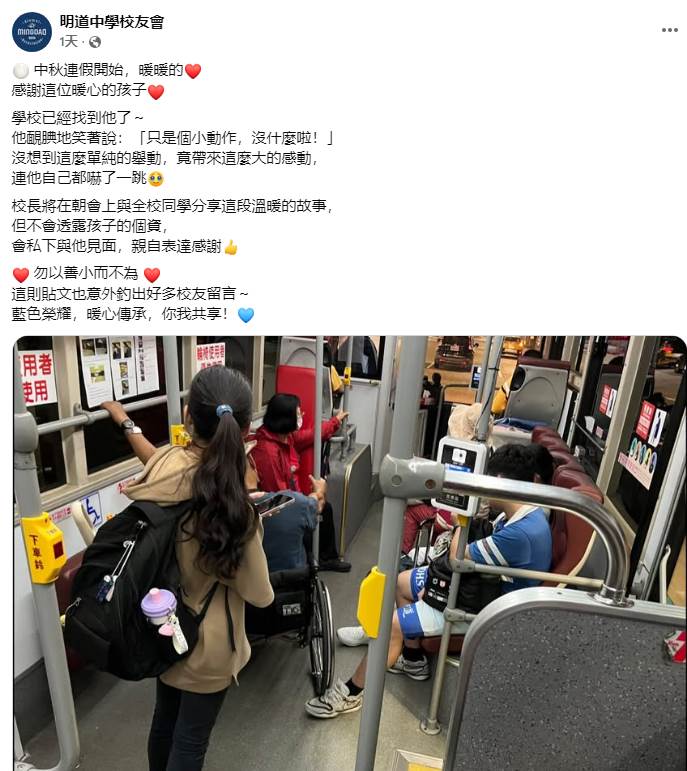 日前,網紅部落客「潔媽」在社群上分享搭公車看到的暖心一幕,讓一名台中明道中學的男學生默默保護長輩的善舉在網上爆紅,而這名學生也被部分網友善意戲稱是「善良的一腳超人」。如今,明道中學校友會指出,校方已經找到了這名善良的孩子,而他只是靦腆的笑說:「只是個小動作,沒什麼啦!」校友會指出,校長之後會在朝會上與全校同學分享這名學生的善舉,並私下與他見面表達感謝,但是為了保護孩子,不會透露他的個資。
