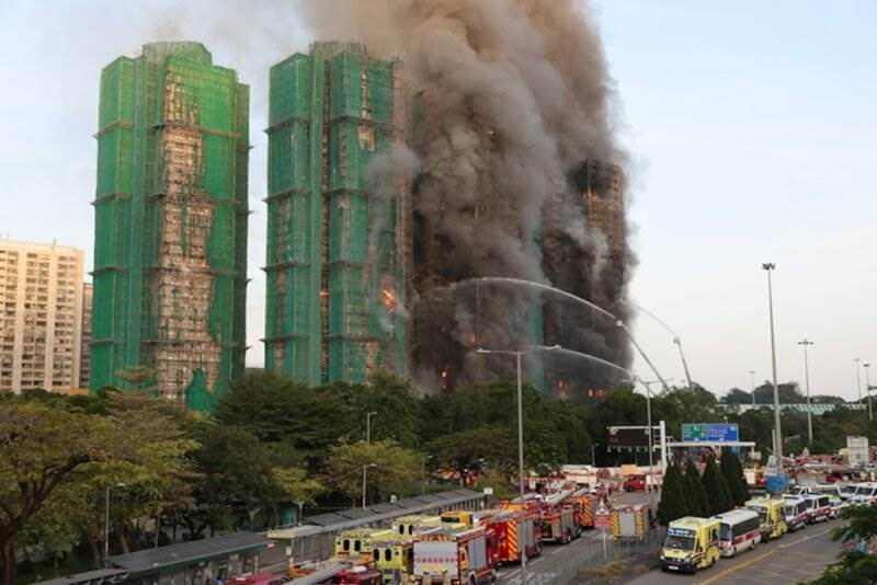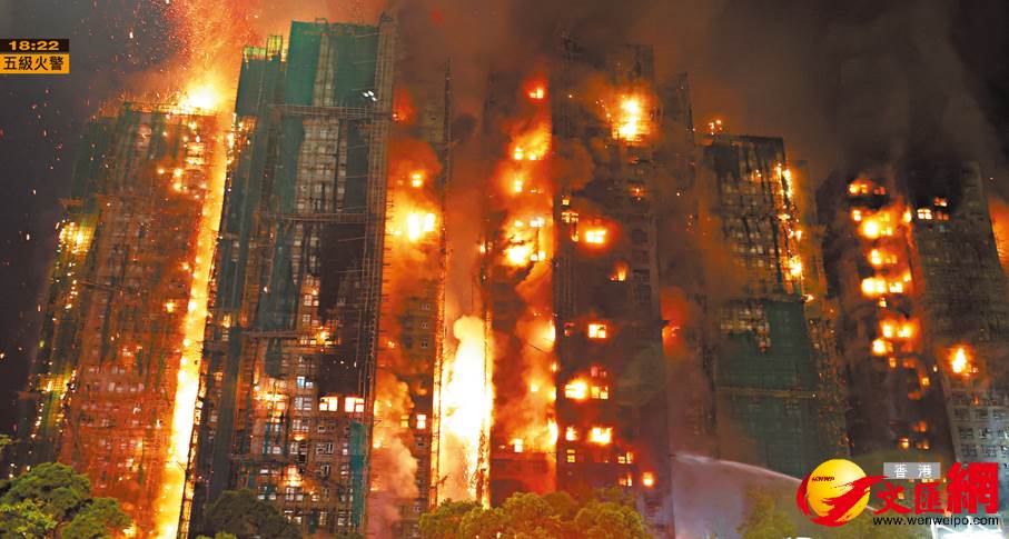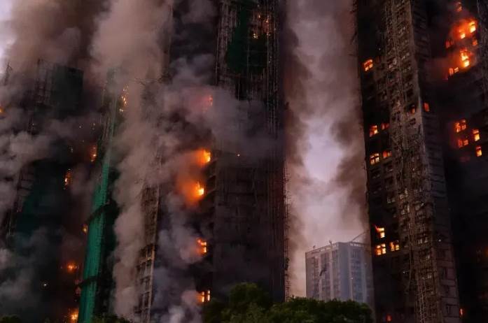 然而住戶的疑慮在一個月後成為血淋淋的現實。昨日下午疑似有菸蒂點燃鷹架外層的防護網,火苗順著鷹架結構快速竄升,加上當時風勢強勁,燃燒中的鷹架碎片四處飛散,導致鄰近建築的鷹架也接連起火,並引燃大量住宅內部。到了晚間,8座大樓中已有7座陷入火海,災情瞬間升級為最高等級的「五級火警」。