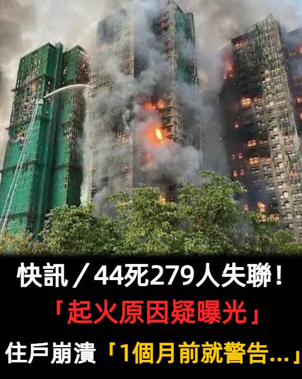 根據《TVBS新聞網》報導,香港大埔「宏福苑」社區昨日下午驚傳嚴重火警,多棟建築遭烈焰吞噬,截至今日清晨火勢仍持續悶燒,已造成至少44人喪生、279人下落不明。諷刺的是,該社區居民早在一個月前就曾在網路上討論過維修工程可能帶來的火災隱憂,如今竟不幸應驗。