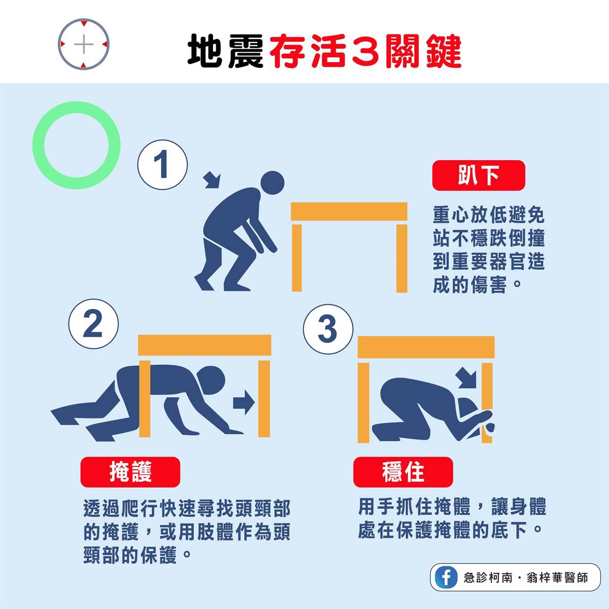 翁梓華指出,強震會讓人完全無法站立,因此民眾可以在被震倒之前,先放低重心,避免跌倒時撞到重要器官,造成傷害,這也是第一個能保護自己的關鍵。