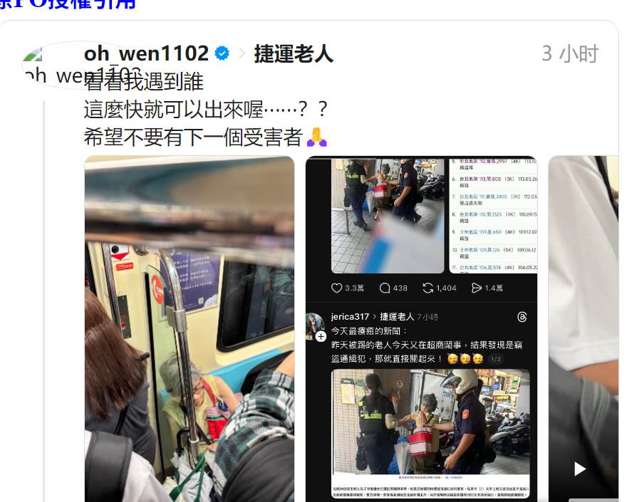 分享影片,直擊曾婦重新出現在捷運車廂內。拍攝者阿文表示,自己巧遇對方時相當訝異,驚呼:「看看我遇到誰,這麼快就可以出來喔⋯⋯?希望不要有下一個受害者。」