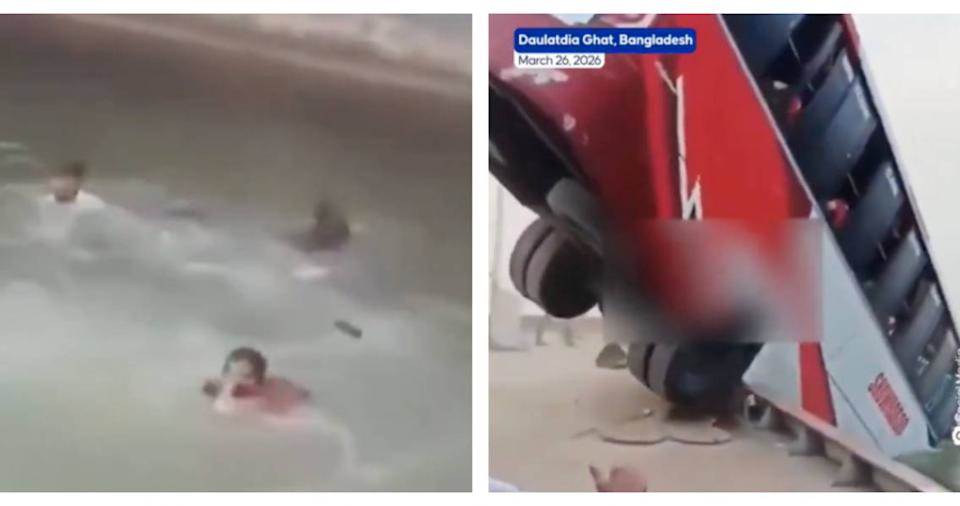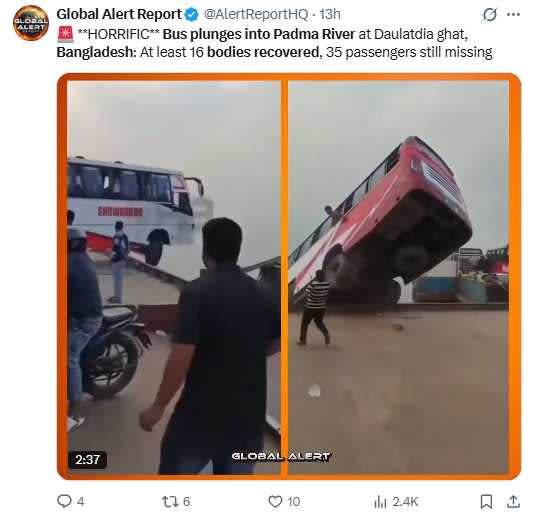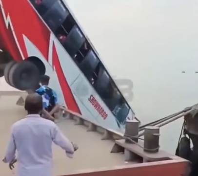客運巴士在渡輪碼頭失控衝出船面,隨後墜入帕德瑪河。(圖/翻攝自X,@AlertReportHQ)