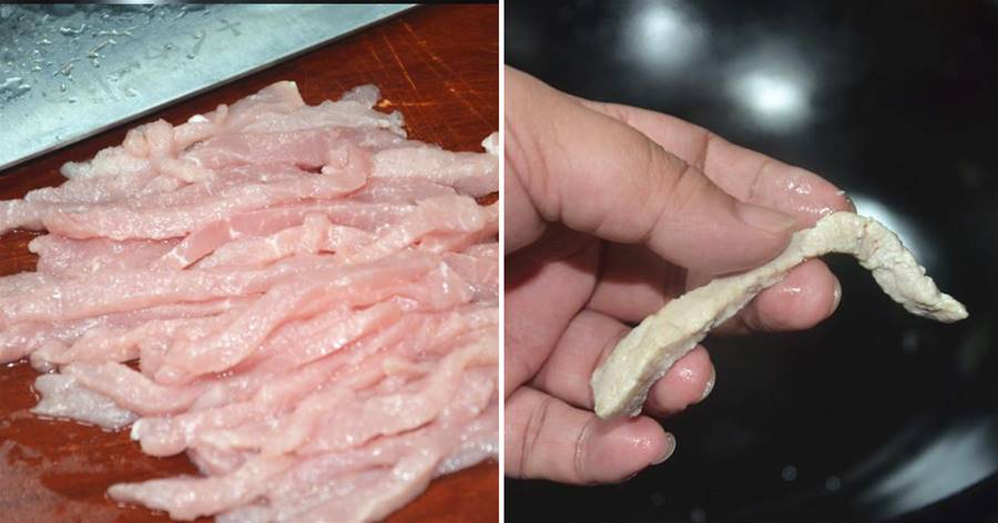 4、先炸青紅辣椒條備用,再炸瘦肉至發白;