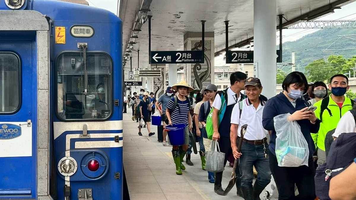 許多揹著救援工具的「鏟子超人」在光復站下車,大家不約而同自發投入救災。(取自台鐵臉書)