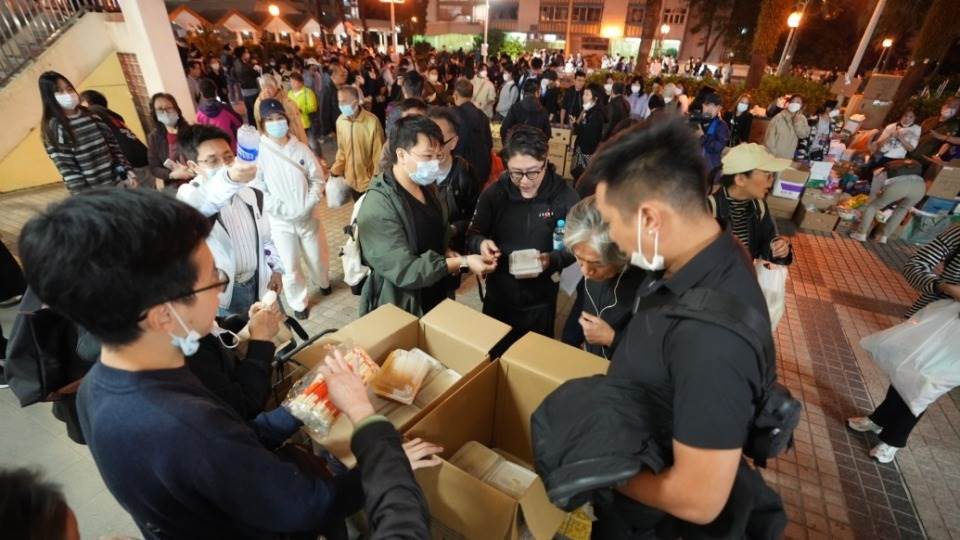 11月27日,義工在宏福苑附近向受火災影響的市民派發物資。新華社 圖