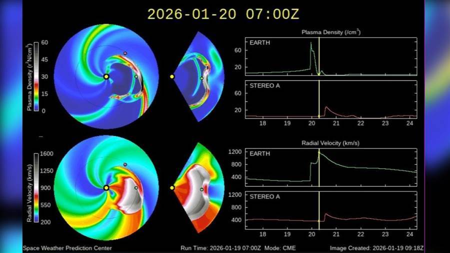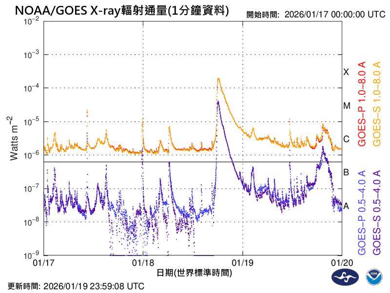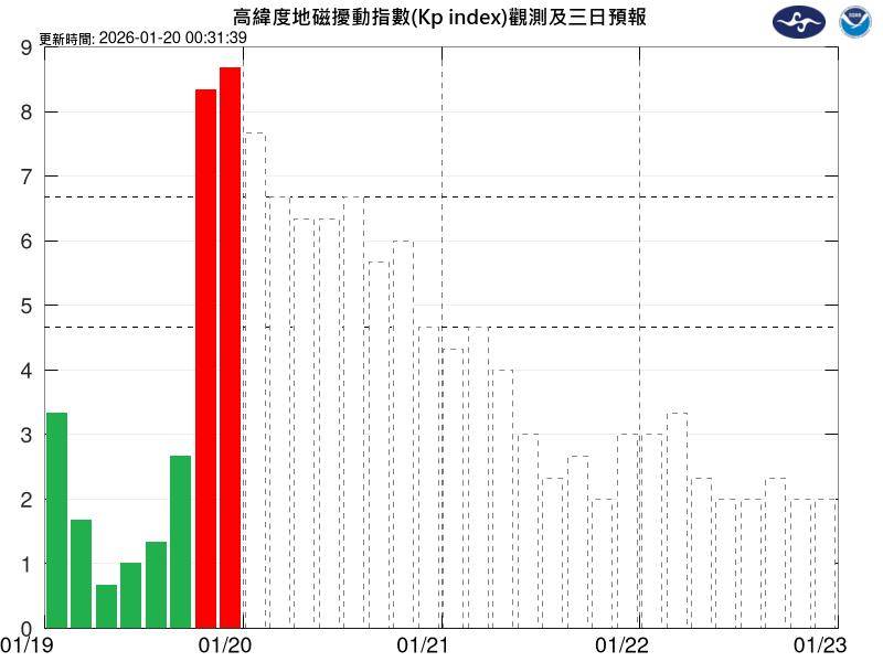 中央氣象署太空天氣作業辦公室說明,受到太陽表面活躍區(AR4341)1月19日發生X1.9級長延時太陽閃焰,並伴隨著顯著的日冕物質拋射事件(CME)于台灣時間1月20日凌晨2時通過近地太空環境,造成行星際空間中的太陽風風速及密度明顯增加,依據NOAA WSA-Enlil模式資料分析,預估地磁擾動將有明顯增強並持續影響約36小時,最大規模可能短暫達到劇烈磁暴等級(Kp=9, G5)。