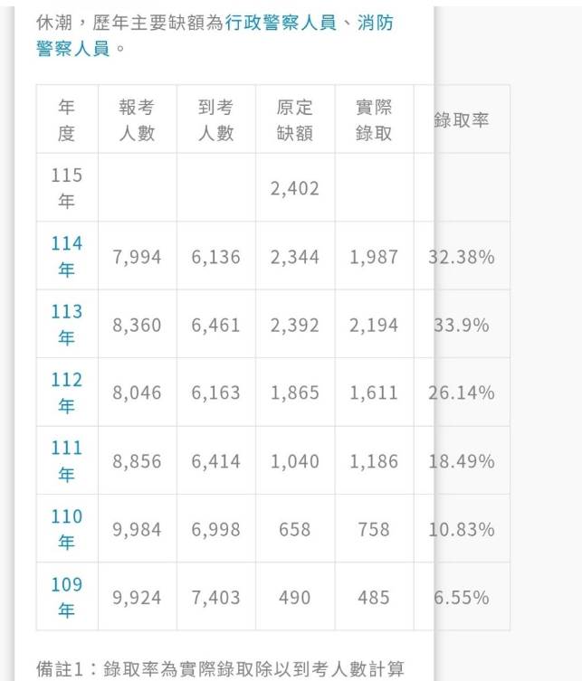 查看考選部公布的資料,114年一般警察特考報名人數為7994人,到考人數6136人,原開放缺額2344人,撇除成績未達標者,最終錄取人數為1987人,顯見成績達50分以上即有機會考進,錄取率高達32.38%。