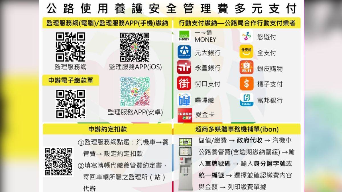中壢監理站表示,115年度營業車春季「公路使用養護安全管理費」繳費單已經以新名稱顯示,請收到繳費單的車主不必驚慌,繳納期限至115年3月31日止,未依限繳納者,依法將處新台幣300元以上至3000元以下罰鍰,提醒車主注意自身權益,以免受罰,造成荷包失血。尚未繳納的車主,可多利用11種支付方式以APP進行繳費,包含一卡通MONEY、嗶嗶繳、橘子支付、蝦皮購物、街口支付、悠遊付、永豐銀行、元大行動、全支付、台北富邦銀行及愛金卡,即可免出門快速繳納。
