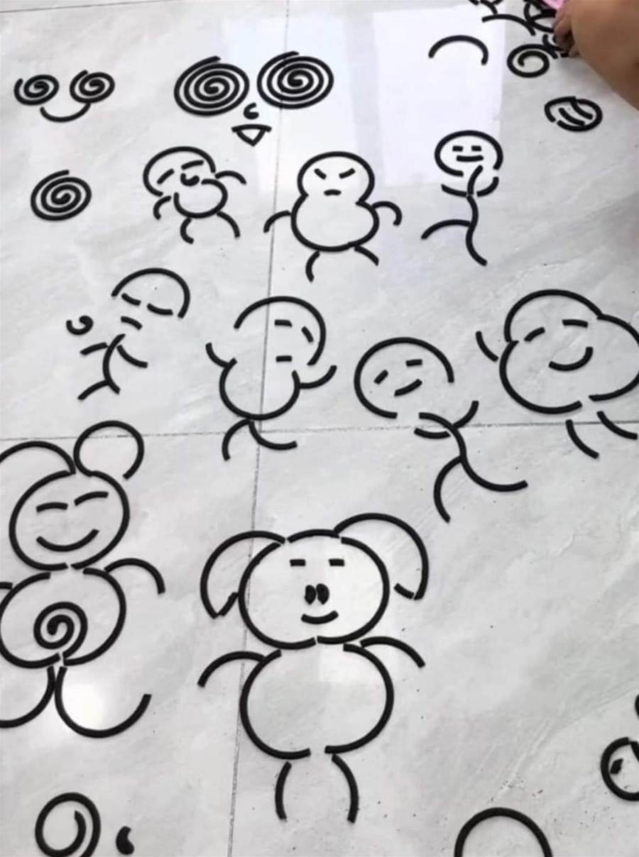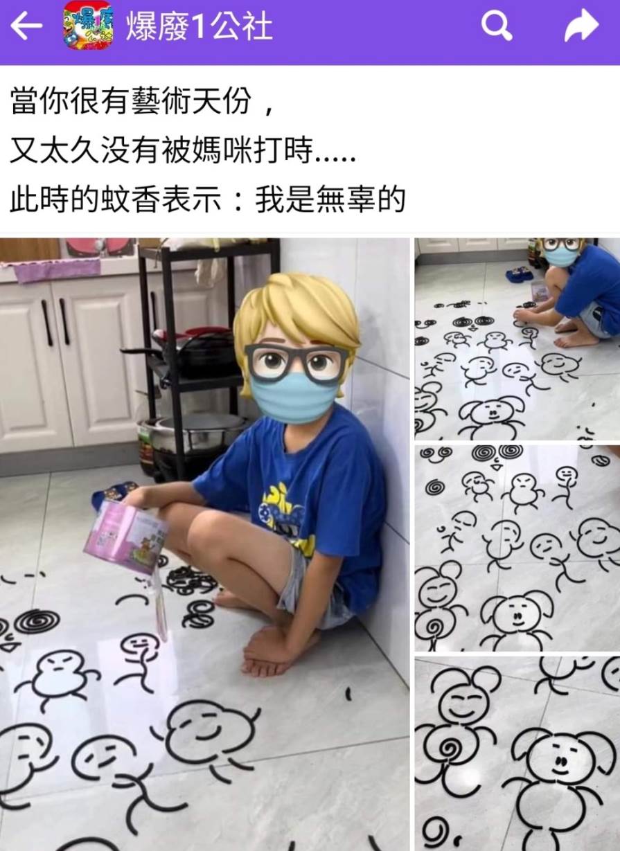 有網友在臉書社團《爆廢1公社》貼出4張照片表示:「當你很有藝術天份,又太久沒有被媽咪打時……。」畫面中有個小弟弟把一圈圈的蚊香從盒子裡拿出來,擺在家裡地板上,還將蚊香折成不一樣的長度,排出藝術創作。小男孩將蚊香當成創意素材,讓彎彎曲曲的線條變成活潑的小人物,各個表情生動有趣。