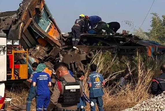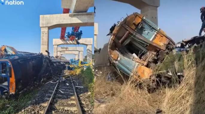 泰國發生一起起重機砸翻火車意外,造成22人死亡70人受傷。(圖/翻攝The Nnation)泰國曼谷當地時間今(14)日早上發生一起重大鐵路意外。一輛火車在行駛期間,突遭一倒塌的起重機砸中並翻覆,造成車內22人死亡、80人受傷。據了解,該起重機正在進行于鐵軌正上方的高速鐵路建設。火車遭倒塌起重機砸中翻覆 釀22死80傷綜合外媒報導,今日上午9點13分,一輛有3節車廂並載有195人、從曼谷前往烏汶府的火車,才剛從農南坤站出發,就在9點15分遭正上方高鐵工程的起重機砸中,火車的其中2節車廂因與起重機的殘骸纏繞在一起,導致火車在呵叻府西丘脫軌翻覆,第2節車廂也因此起火。據了解,在農南坤站與其下一站西丘站之間,多數乘客皆為通勤的學生或上班族。