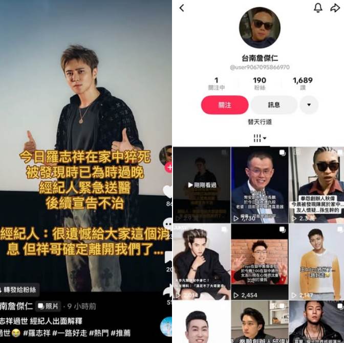 事實上,謠言來自一名網友在抖音發布羅志祥照片,並捏造內容指稱他在家中猝逝、送醫後不治,甚至假借經紀人名義發出聲明。該貼文迅速擴散,累積超過450萬次瀏覽。由于該賬號過去就曾散播多起類似謠言,包括指稱吳奕帆獄中身亡、Toyz因舊傷過世、王Aden離世,以及瘦子巡演期間發生不測等,內容荒誕離譜,也讓外界質疑此次羅志祥死訊同樣是惡意捏造。