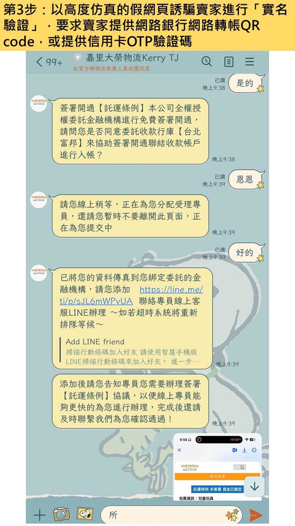 更為狡猾的是,假客服會進一步誘騙賣家進行所謂的「實名驗證」,要求賣家提供網路銀行轉賬QR碼,或是信用卡OTP驗證碼,最終目的是盜刷信用卡或提領賣家賬戶款項。