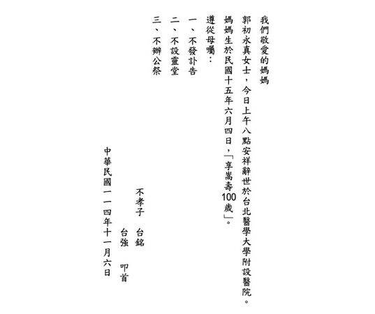 郭台銘在臉書貼文提到,母親生于民國15年6月4日,並表示將遵照母親生前囑咐,對于後事有3遺願:「不對外發布訃告」、「不設置靈堂」,也「不舉辦公祭儀式」,一切從簡處理後事。