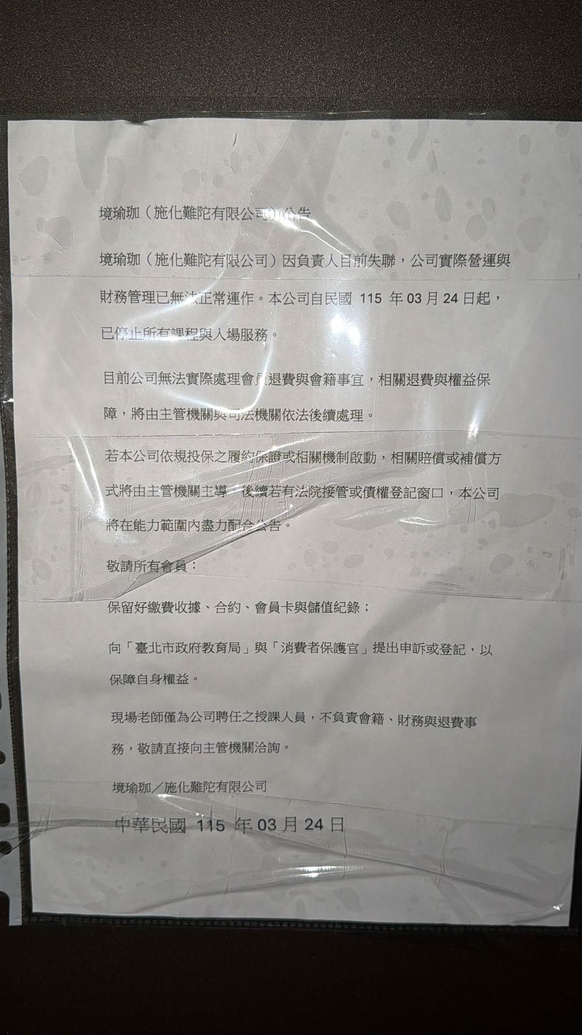 基隆市一家知名瑜珈教室「瑜珈境」負責人失聯,教室突然貼出停業公告,引發會員憤怒集結陳情。民進黨基隆市議員施偉政24日接獲陳情表示,多名會員繳交上萬元會費後,瑜珈教室卻無預警倒閉,找不到負責人辦理退費,讓會員權益受損。