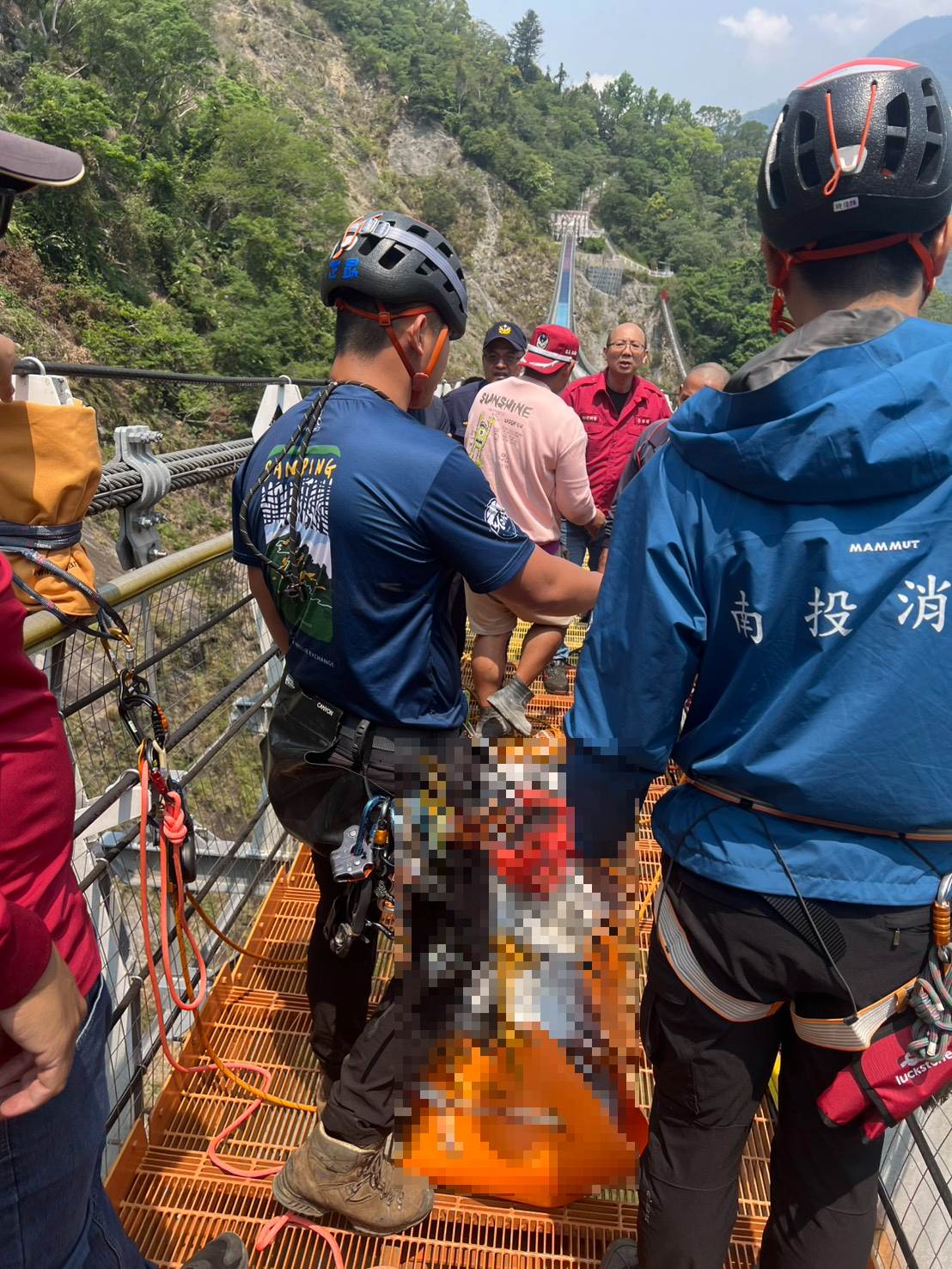 南投縣消防局接獲報案後立即派員趕往現場,先是在景區附近尋獲邱男所騎乘的機車及個人隨身物品,隨後調閱監視器畫面,赫然發現邱男已從高達115公尺、約40層樓高度的雙龍吊橋墜落溪床。