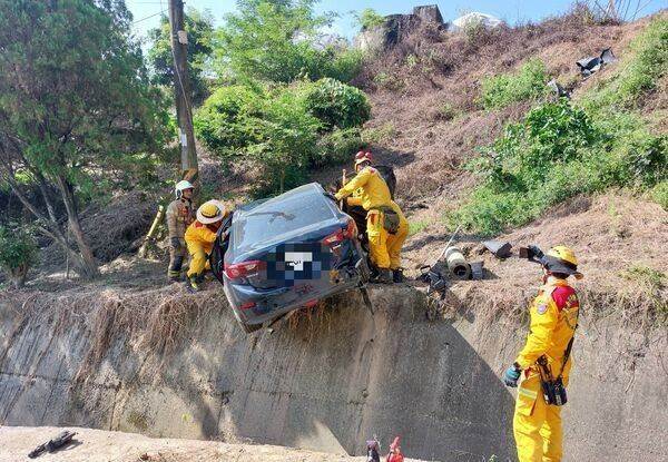 這起事故發生在上午 8 時 28 分許,警消獲報後,緊急動員 9 輛消防車、23 名人員趕抵現場。由于轎車深陷邊坡,且車體扭曲變形,車上包含蘇男在內的兩人一度受困。消防人員緊急利用繩索固定並破壞車門,才成功將三人救出送醫。