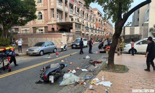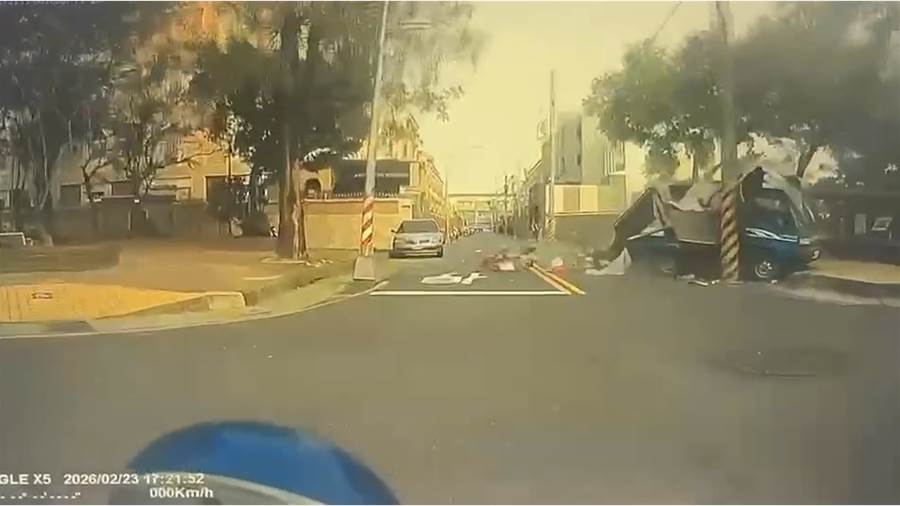 由于事發地點鄰近校園,正值家長接送放學的交通尖峰時段,貨車直接攔腰衝撞多輛機車,現場一片狼藉。
