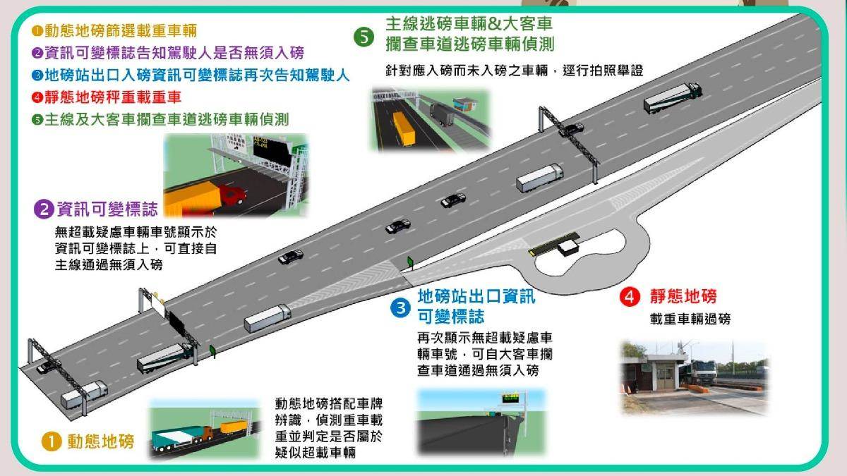 為提升大貨車過磅效率並防止超載與逃磅現象,交通部高速公路局宣佈自3月1日起,國道主線將新增3處動態地磅系統正式啟用,分別位于國道1號員林北向、國道1號新營北向以及國道3號龍潭南向。該系統運用三道門架,透過AI辨識及動態偵測精準篩選車輛,若違規逃磅,依據《道路交通管理處罰條例》可處新臺幣9萬元罰鍰。