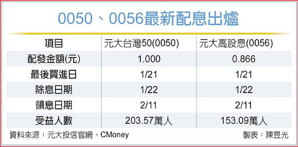二大重量級ETF 0050元大台灣50、0056元大高股息最新配息出爐,每受益權單位分別配發1元及0.866元,同步于22日除息、2月11日發放配息,預計將有超過356萬名投資人將可在農曆過年前領到配息紅包。