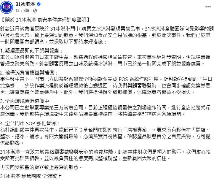針對此事,31冰淇淋發表聲明指出,經初步查明係現場營運管理疏失所致。業者表示冰淇淋皆由日本工廠生產,製造過程經過嚴格品質控管。門市已于第一時間完成疑慮產品下架與報廢處置,並為消費者辦理全額退款及完成POS系統作廢程序。針對消費者提及的生日兌換券,系統作業流程將于退款後自動退回,業者並將提供額外致歉補償。