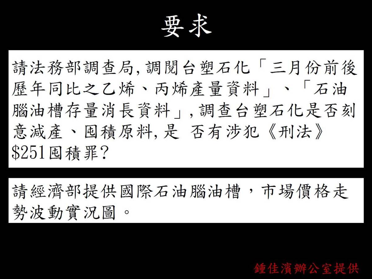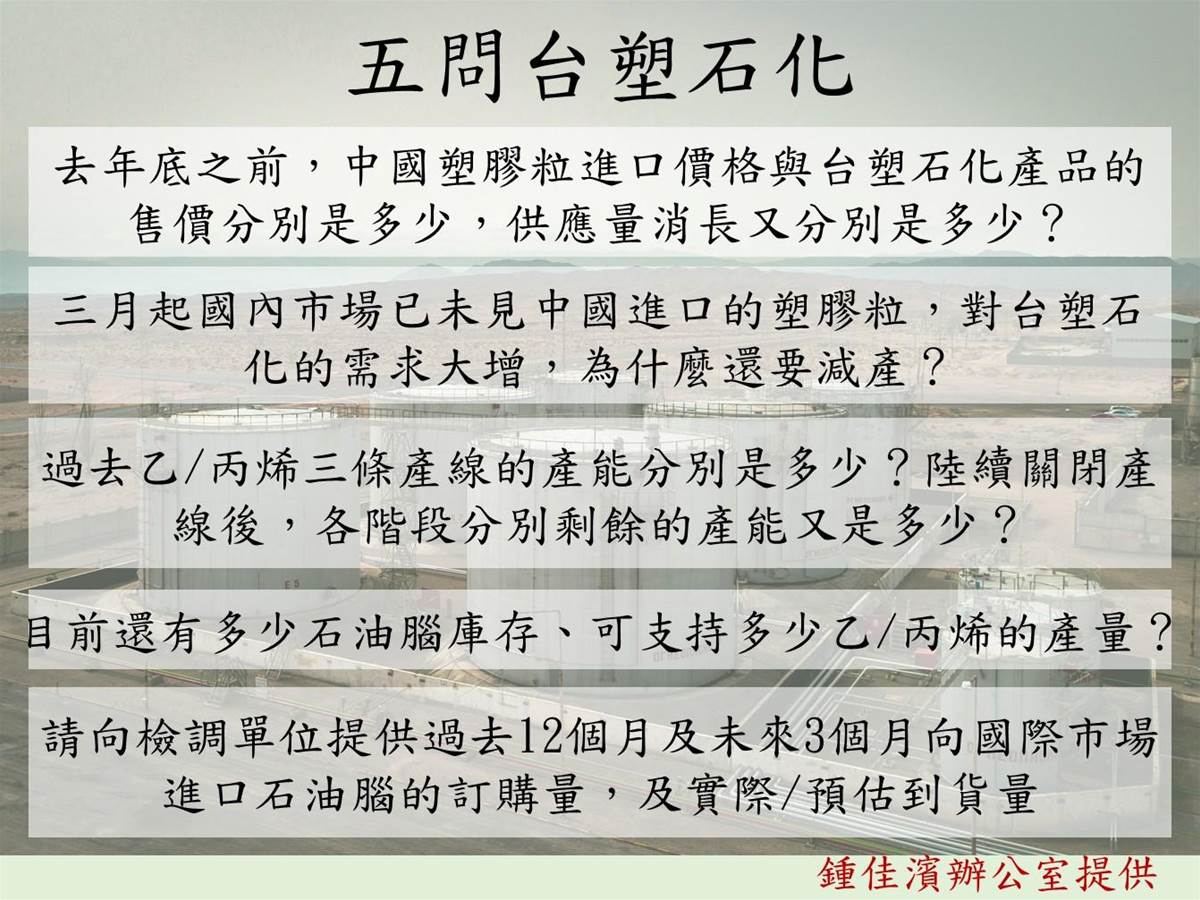 鍾佳濱強烈要求經濟部、法務部與調查局立即介入,徹查臺塑石化過去一年的產線排程、石油腦庫存及進口資料,釐清為何在去年中國廉價產品進口時不減產,卻在國內最需要本土產能時恐惡意斷料,必須查明這背後究竟是國際情勢使然,還是企業藉機發災難財,務必還給社會大眾一個公道真相。
