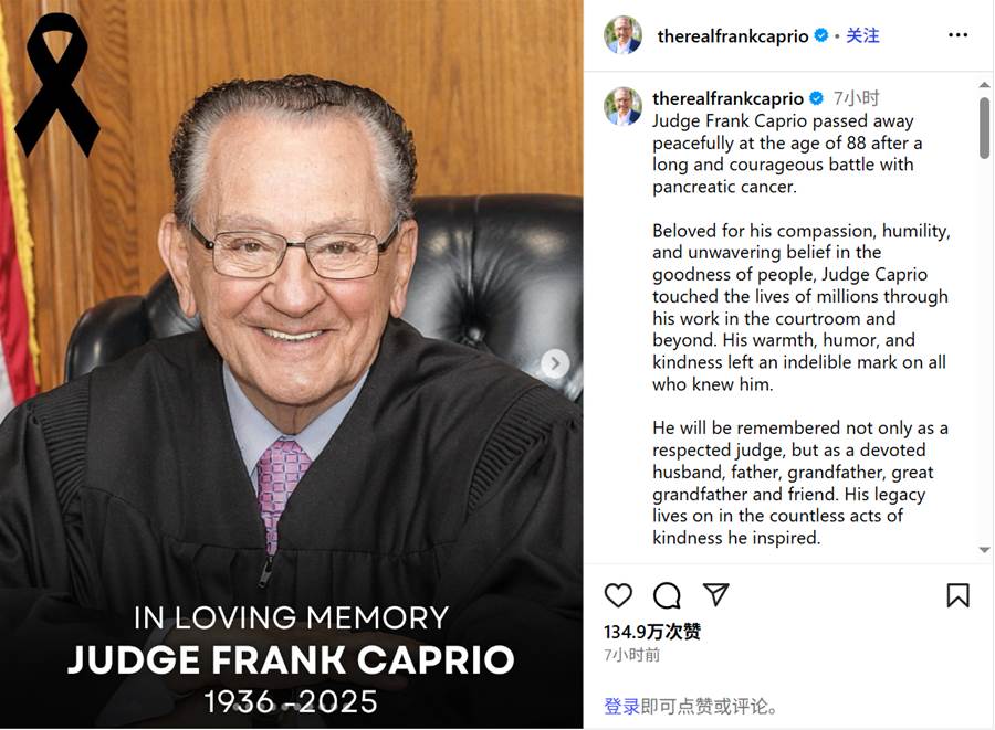 被封為「美國最暖法官」的法蘭克卡普里奧(Frank Caprio)曾是羅德島州普羅維登斯市的首席市政法官,過去因為節目《人民法官(Caught in Providence)》片段影片而走紅,他溫暖又公正、充滿同理心的裁判經過曾引來許多網友熱議。2023年底他證實罹患胰腺癌,近日他的家人證實在歷經漫長與病魔戰爭的過程後,法蘭克于當地時間週三病逝,享壽88歲。