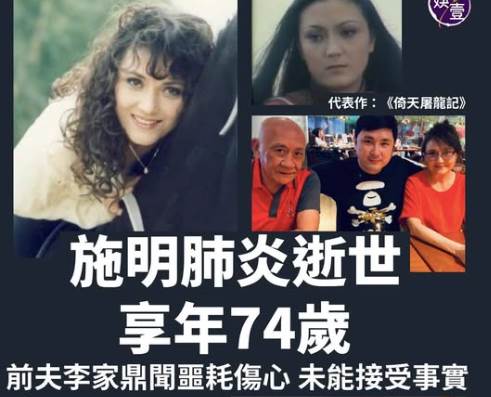 藝人施明年前因在家中一次意外跌倒而頭部重創,需要接受開腦手術。憑藉堅韌的意志力,她在醫院接受長達一年的治療後,終于回到家人身邊。但不幸的是,原本身體日漸穩定的她,卻于近日病情急轉,因肺炎搶救無效于21日離世,享壽74歲。