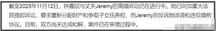 又有明星傳婚變了!據港媒報道,鍾嘉欣在加拿大起訴丈夫Jeremy,要求重新分割財產及三個孩子的撫養權,而丈夫Jeremy也強勢反擊,以誹謗及違反婚前協議等為由進行反訴,雙方矛盾進一步加深,引發熱議。