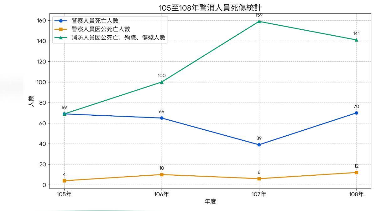 立法院先前公佈資料,近年來警察人員死亡、因公死亡人數,為105年69人、4人,106年65人、10人,107年39人、6人,108年70人、12人;消防人員因公死亡、殉職、傷殘等,則為105年69人、106年100人、107年159人、108年141人。