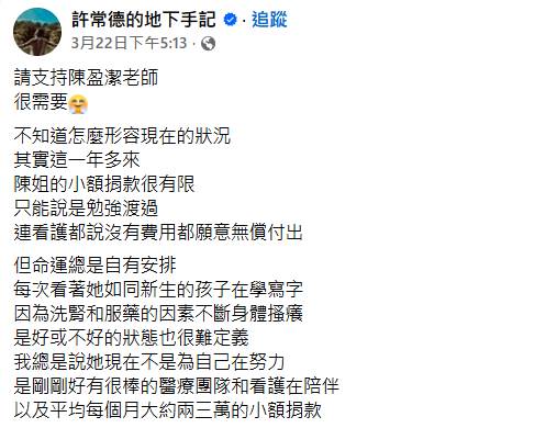 10日他在臉書發文表示,若大家對陳盈潔的故事有所感觸,願意資助其醫藥費的話,「捐款的賬號我放在留言區,真的非常緊迫需要,很擔心快無米之炊」。