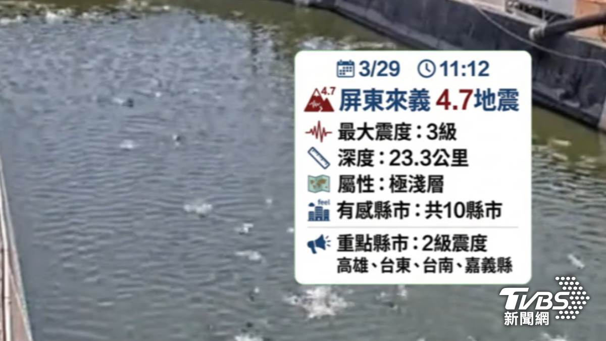 屏東縣來義鄉29日發生規模4.7極淺層地震,全臺10縣市有感,地震前林邊溪出現大量魚群跳出水面異象!氣象署指出,此次地震位于過去30年僅發生17次規模4以上地震的「空白區」,未來3至5天需留意規模4至4.5餘震。