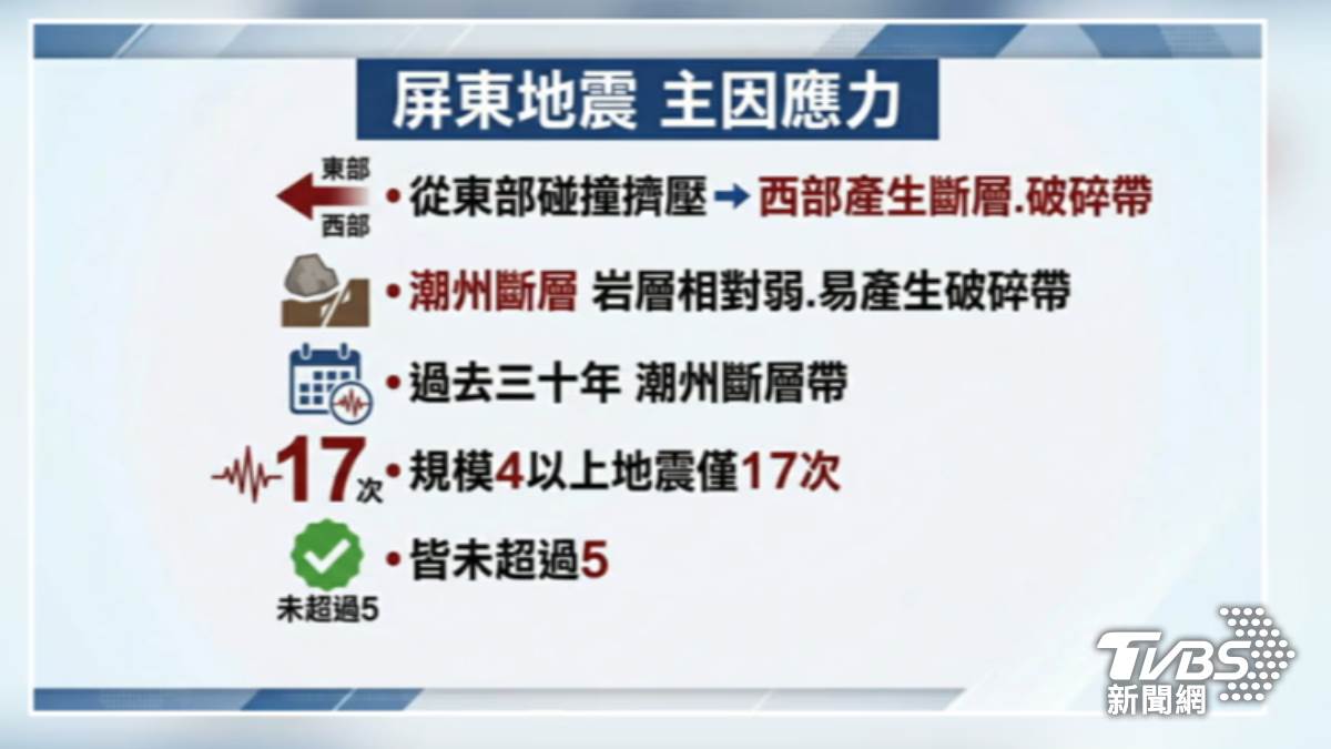 氣象署進一步指出,此次屏東地震的主因為應力從東部碰撞擠壓,在西部產生斷層及破碎帶並釋放能量。由于地震位置接近潮州斷層,該處巖層相對較弱,容易產生破碎帶。過去30年間,潮州斷層帶發生的地震次數與規模僅有17次,雖然規模皆大于4,但都未超過5。此次地震對于能量釋放有所幫助,不過民眾若發現其他異常現象,仍需提高警覺。