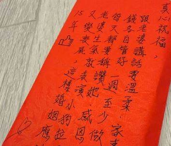今陳漢典曬出小S紅包袋,鼓起一疊,上頭寫道婚後6注意事項:「真心祝福,跟老婆講話要溫柔,家事你要做,錢各自管好,一週至少4次,每天都要稱讚她,感恩一切,老婆生氣就表演小狗拉屎的同時又變喪屍,這樣婚姻應該可以撐15年」,附上手繪按讚emoji,讓陳漢典直呼「愛你喔」。