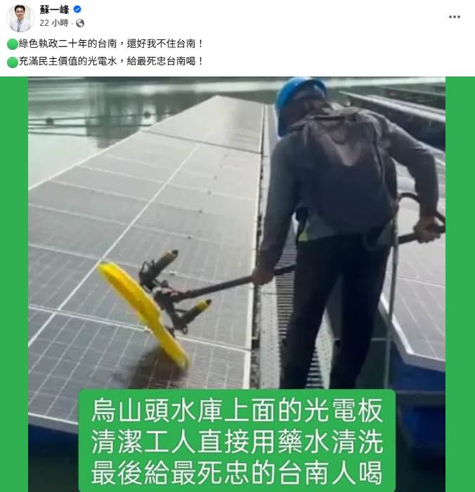 醫師蘇一峰10日則在臉書發文指:「烏山頭水庫上面的光電板,清潔工人直接用藥水清洗,最後給最死忠的台南人喝。」蘇一峰稱:「綠色執政20年的台南,還好我不住台南!充滿民主價值的光電水,給最死忠台南喝!」
