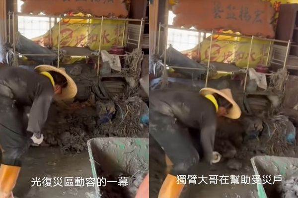 這名網友在TikTok分享影片,光復鄉的災情發生以後,有許多志工投入救災的行列。他在災區現場看見,有位「獨臂超人」正在賣力清除淤泥,且手上的動作相當熟練,讓他不禁濕了眼眶,「看得我眼睛熱熱的。」