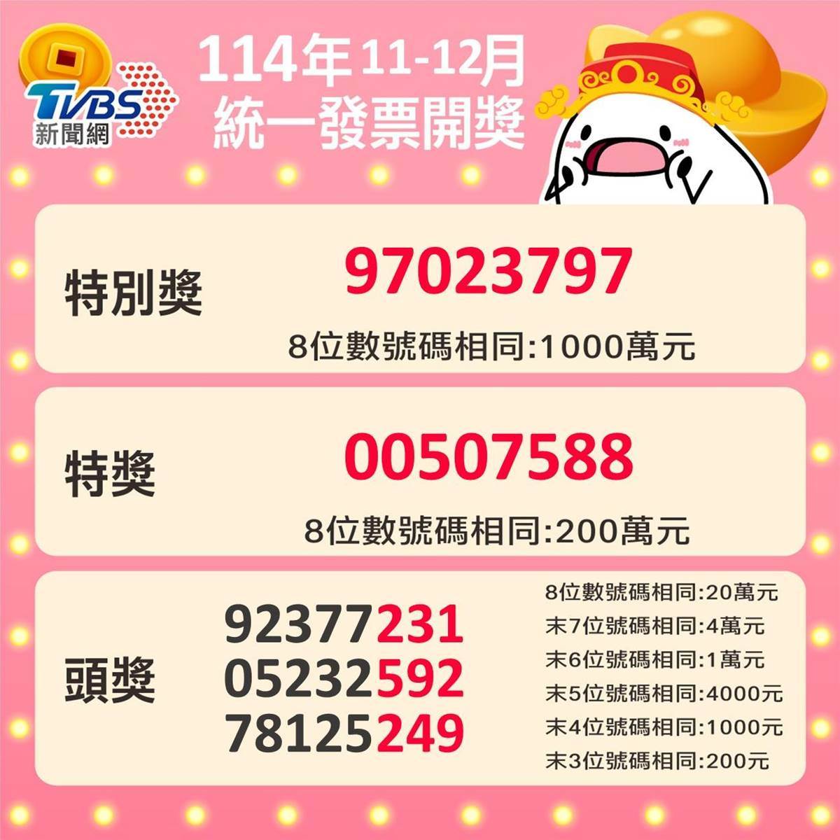 114年11、12月統一發票中獎號碼出爐,千萬元特別獎號碼為「97023797」,共17人中獎;200萬特獎號碼為「00507588」,共20人中獎,其中7-11、全家、全聯各開出2張。