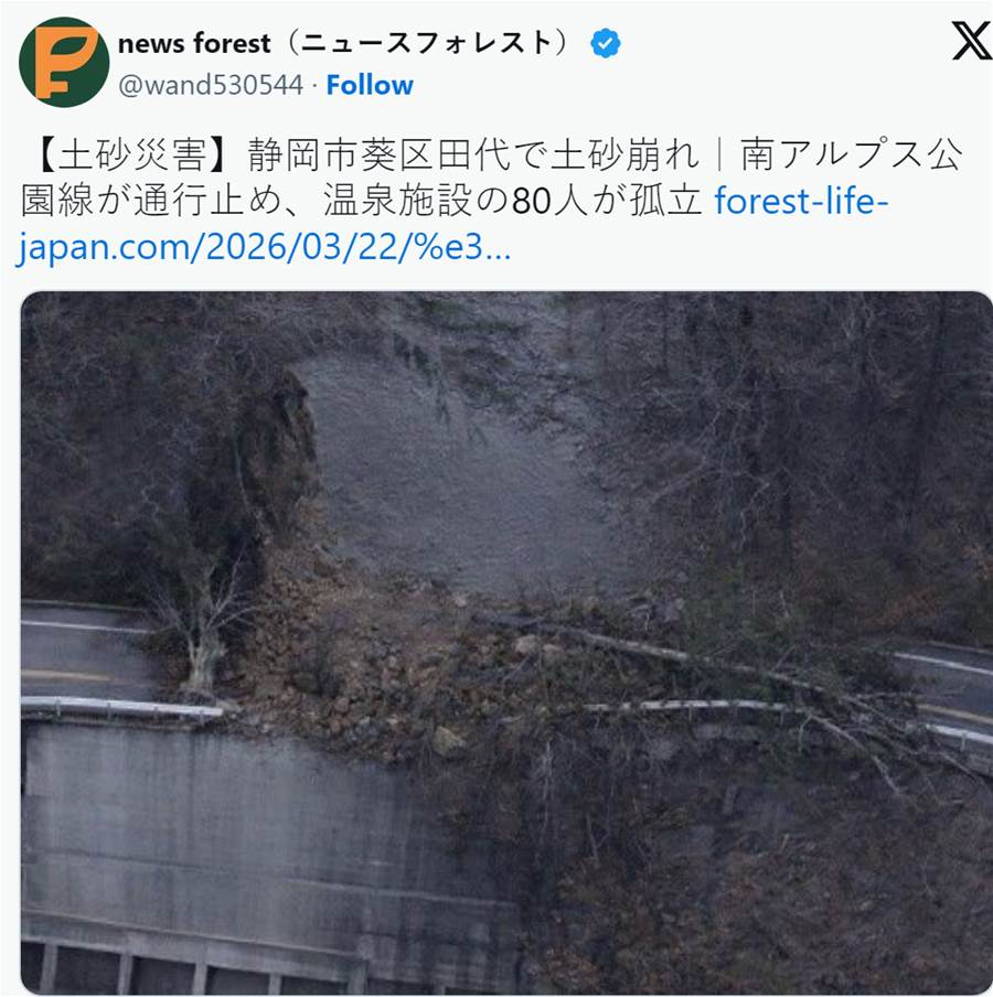 日本靜岡縣靜岡市葵區21日上午發生大規模土石崩落,縣道南阿爾卑斯公園線旁斜坡大面積坍塌,導致道路全面中斷,包含登山客、登山小屋住宿人員與工地作業人員在內約79人一度受困山區。所幸目前未傳出人員傷亡。