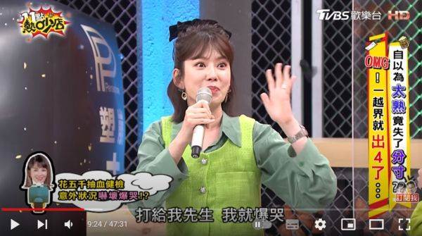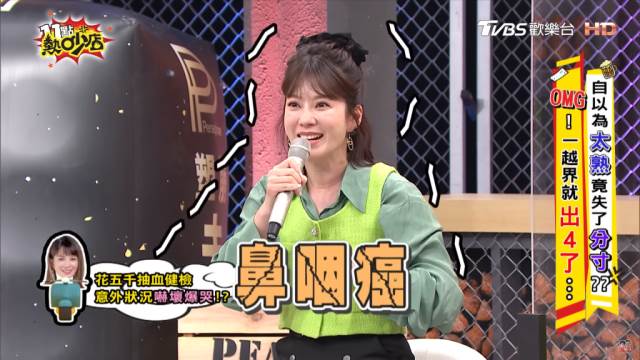 根據《ETtoday》報導,Melody經常在節目「11點熱吵店」分享生活中的大小事,她透露有次聽了朋友的建議,花5000元去抽血檢查,原本醫院告知2天就可以看報告,沒想到卻遲遲沒有下文,正當覺得奇怪的時候就收到檢驗中心的電話,跟她說明某個指數有點高,需要再用一管血重新檢測,在她的追問之下對方才明說,「鼻咽癌項目的指數有點高」。