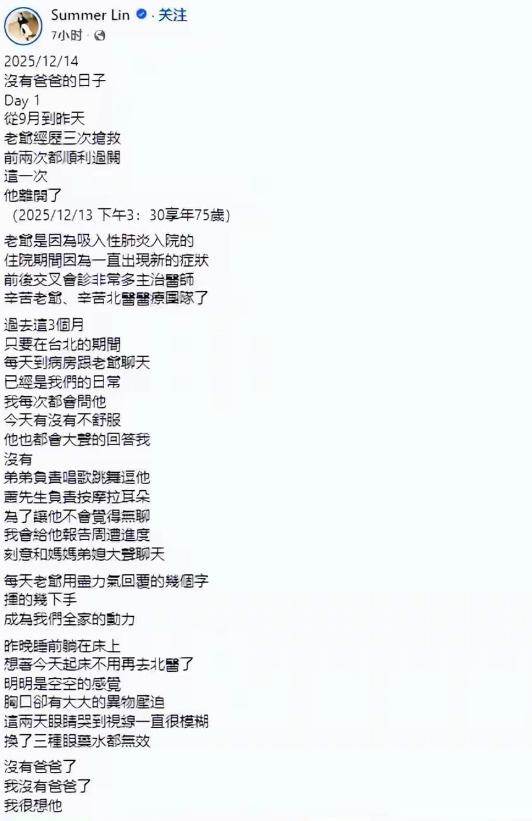 除此之外林有慧還發長文悼念自己的父親,表示「胸口有大大的異物壓迫」并且一直從悲傷中無法走出來。