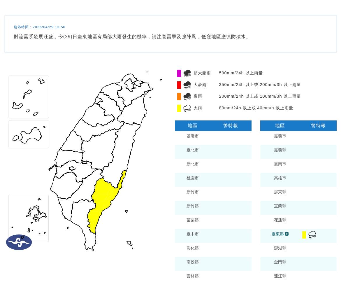 對流雲系發展旺盛,台東地區今(29日)有局部大雨發生的機率。氣象署提醒民眾應注意雷擊及強陣風的威脅,低窪地區應慎防積水情況發生。此外,台中、彰化留意大雷雨。