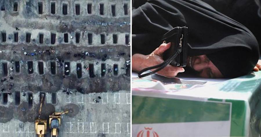 伊朗外交部長阿拉奇在社群平臺釋出集體下葬的空拍影像,痛批受害者屍身被炸得支離破碎。