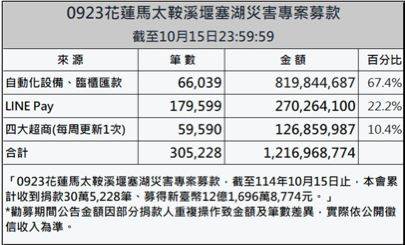 賑災基金會今日傍晚發布新聞資訊,表示9月25日啟動「0923花蓮馬太鞍溪堰塞湖災害專案募款」,統計至今日募得款項12億餘元,總筆數超過30萬筆。目前第一階段慰助金已陸續發放中,第二階段生活支持與關懷照護相關作業亦迅速啟動。