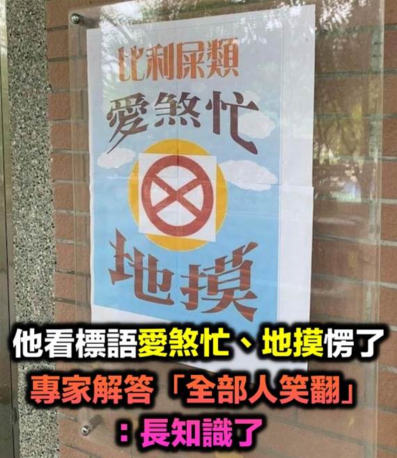 只見照片裡一張貼在牆上的標語紙上寫著,「比利屎類,愛煞忙,地摸」9個大字,中間還配上了禁止的圖案,照片曝光後也讓網友百思不得其解,更有人懷疑是不是把中文寫成了英文發音?還是其實是台語或客語呢?