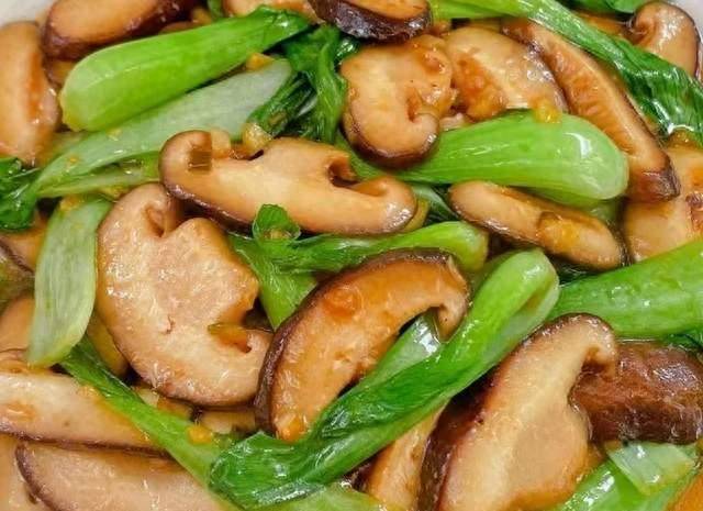 3、起鍋燒油,油熱后放入蒜末和蔥花炒出香味,再放入香菇翻炒片刻,炒至變軟后放入油菜翻炒均勻。