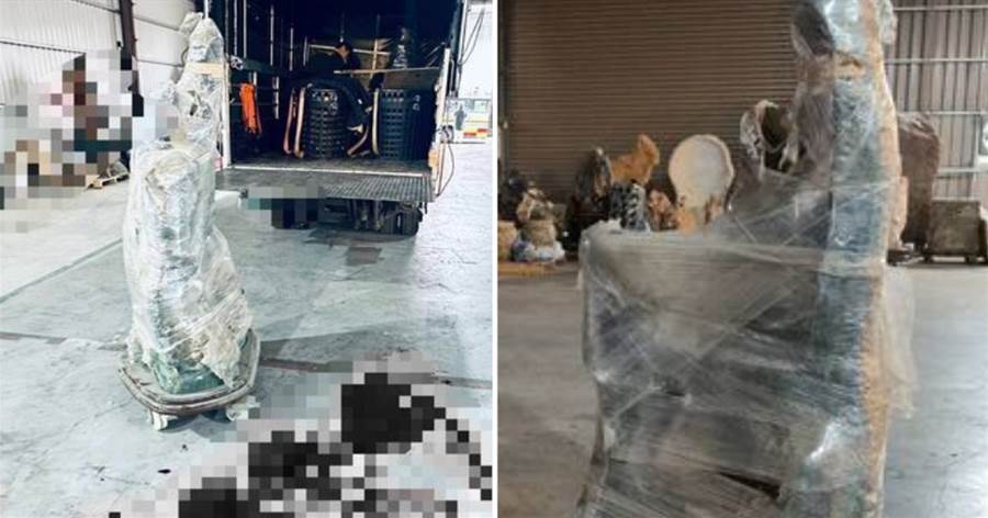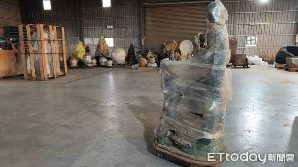 ▲新北五股鐵皮工廠內,擺放藝品店的各式藝品。(圖/記者陸運陞翻攝)