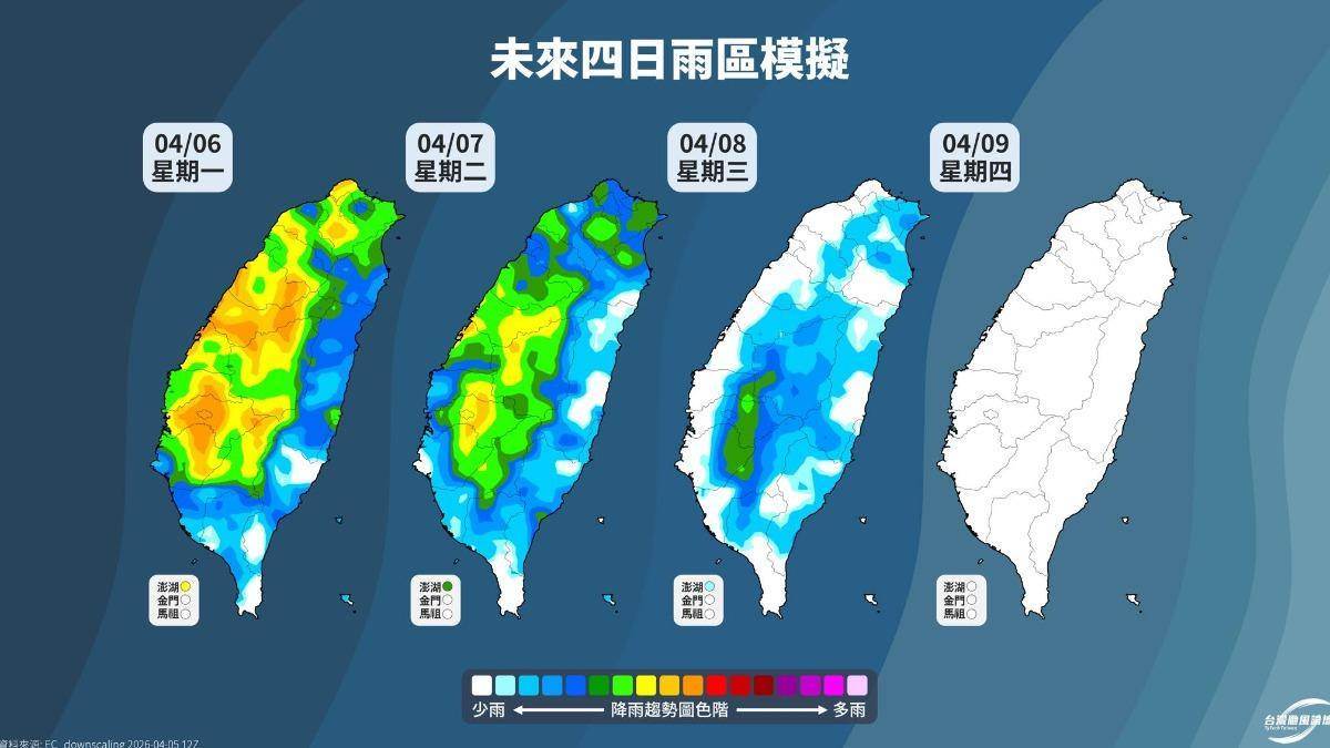 清明天氣陰雨綿綿,中南部更迎來猛烈大雨,氣象粉專指出,臺中、彰化近海隨著煙囪雲消散,今(6)日雨勢逐漸緩和,但明天受到鋒面影響,全臺都有雷陣雨,提醒民眾出門記得攜帶雨具。