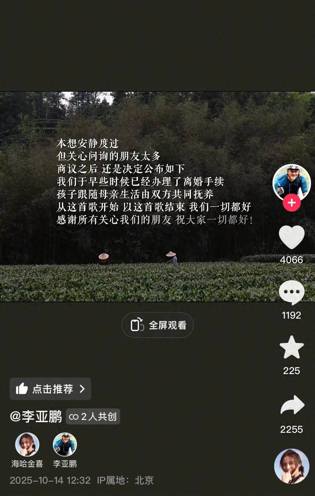 10月14日,李亞鵬和妻子海哈金喜共同發布視訊,稱兩人已于早些時候辦理了離婚手續,孩子跟隨母親生活,由雙方撫養。